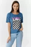 Футболка прямого силуэта, с округлой горловиной спереди и V-образной на спинке, с удлиненной спинкой. Рукав короткий. В верхней части спинки обработан фигурный вырез со шнуром. Горловина обработана бейкой из основного полотна. На полочке эффектная печать с пайетками