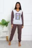 Костюм женский выполнен из меланжированной кулирки. Кофта с длинным рукавом снизу на резинки, горловина окантована, на полочке выполнена печать. Брюки свободного силуэта, по бокам карманы, низ брюк на резинке
