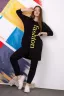 Стильный трикотажный костюм-двойка в стиле спорт шик. Удлиненная туника с потайными карманами, спереди на правой полочке косой срез до бедра. Горловина обработана рибаной. Рукава 3/4. Брючки укороченные, без карманов. Пояс на резинке.