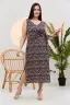 Платье женское полуприлегающего силуэта. Верхняя правая часть полочки со складками запахивается на левую. Прилегание по талии регулируется завязками. От линии бедер платье прямое с боковыми разрезами. В лекалах учтена незначительная усадка ткани после стирки.